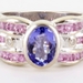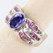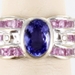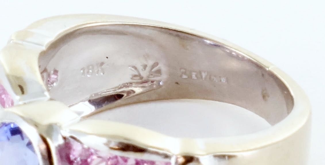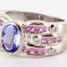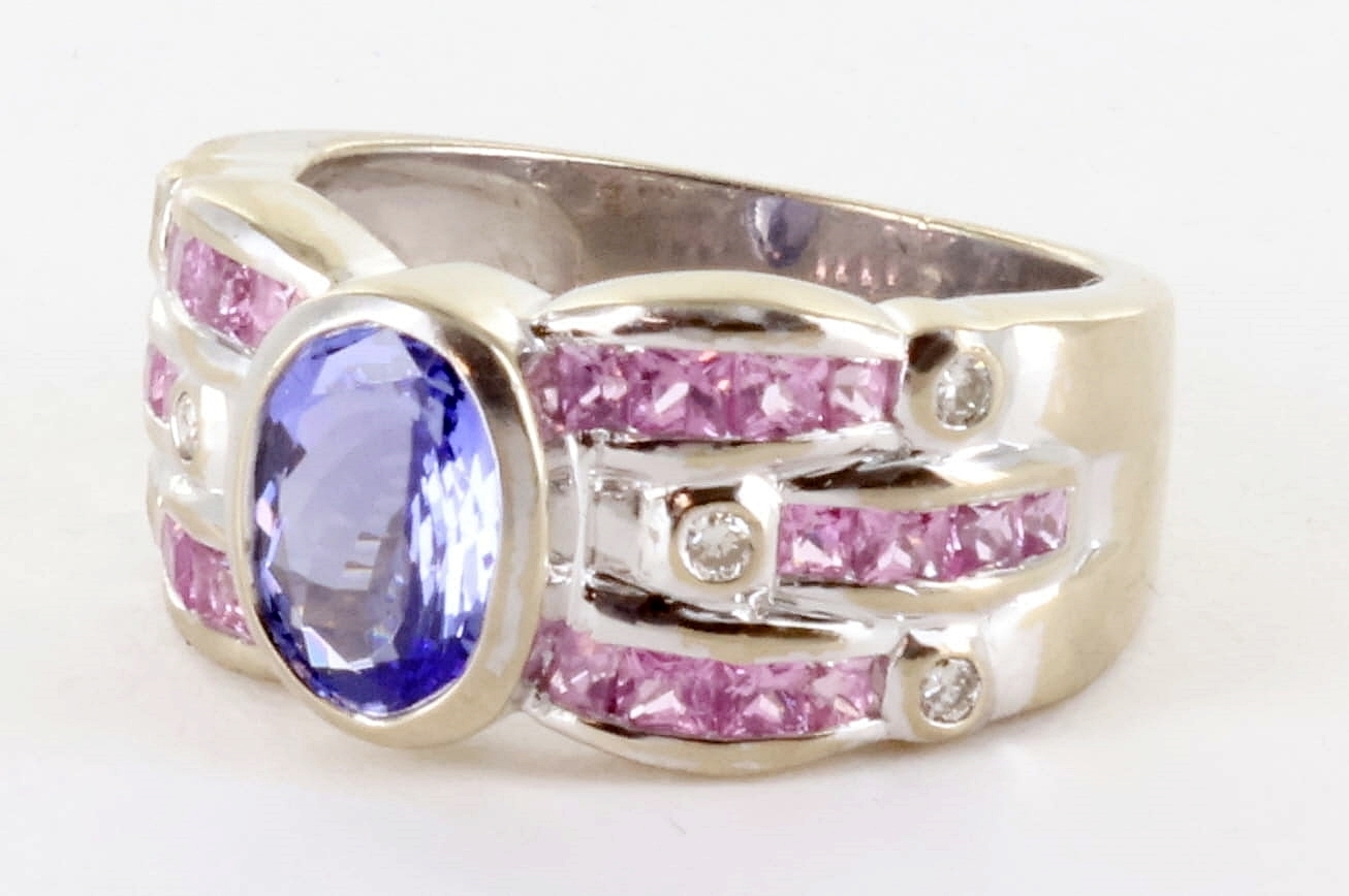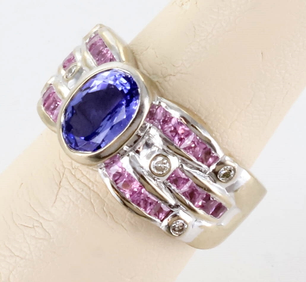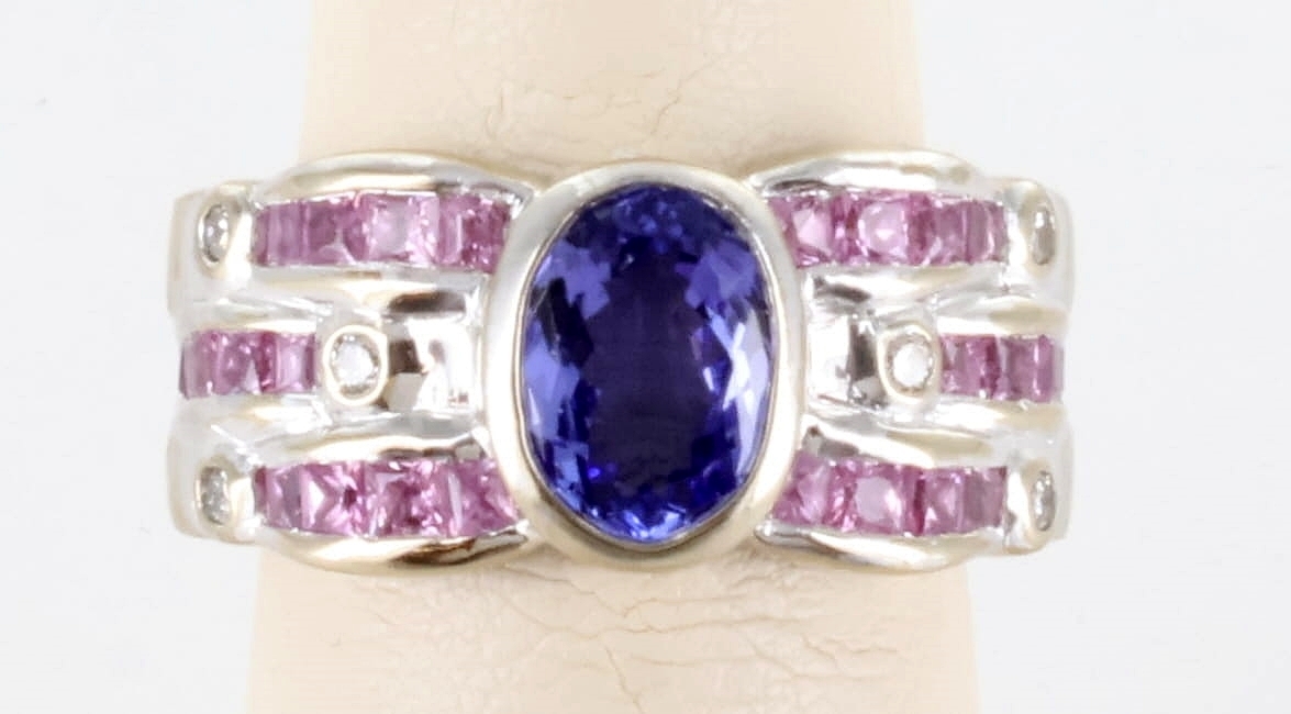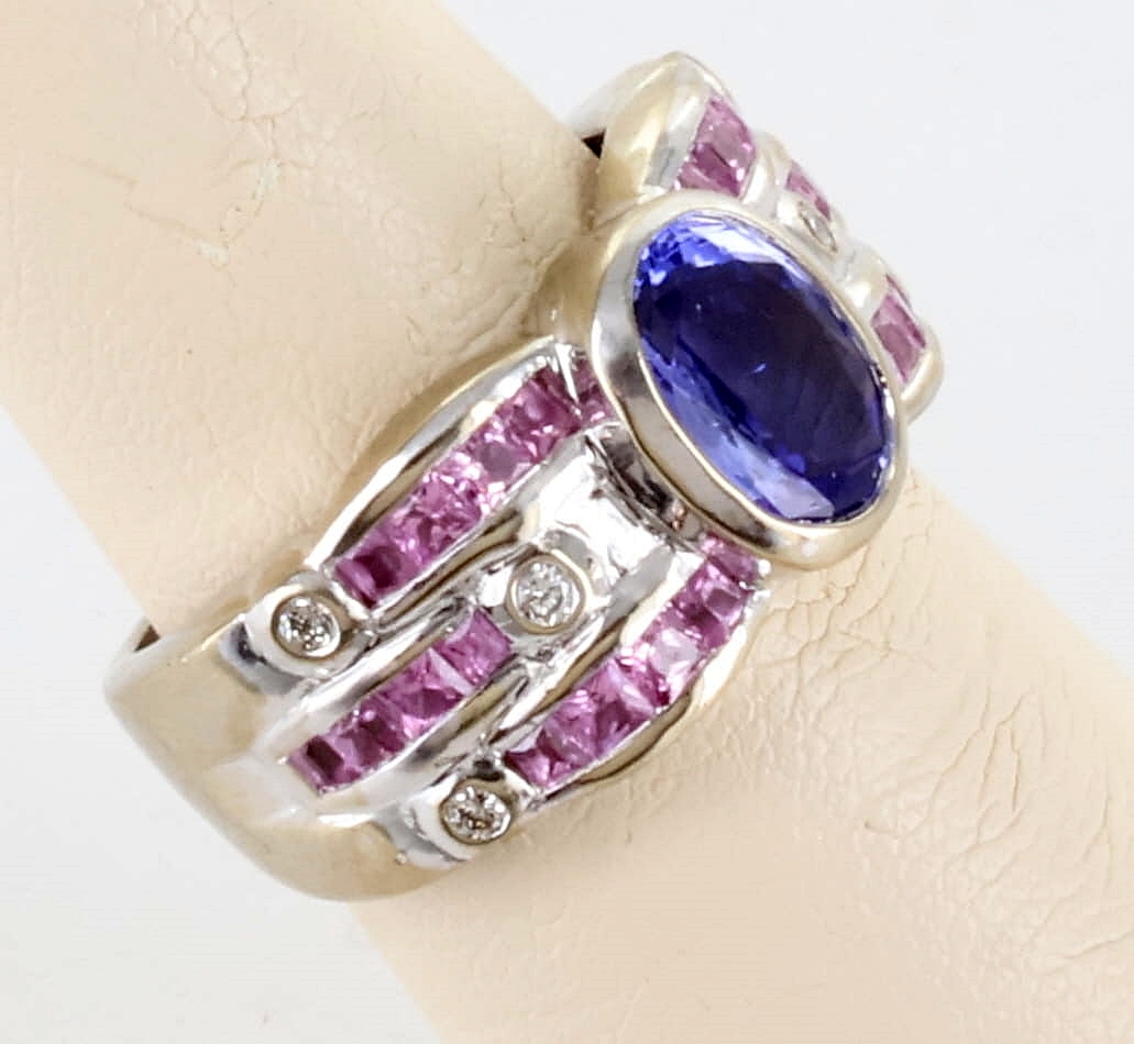 LEVIAN 18K WHITE GOLD BLUEBERRY TANZANITE BUBBLE GUM PINK SAPPHIRE AND DIAMOND STATEMENT RING, SIZE 6.75
