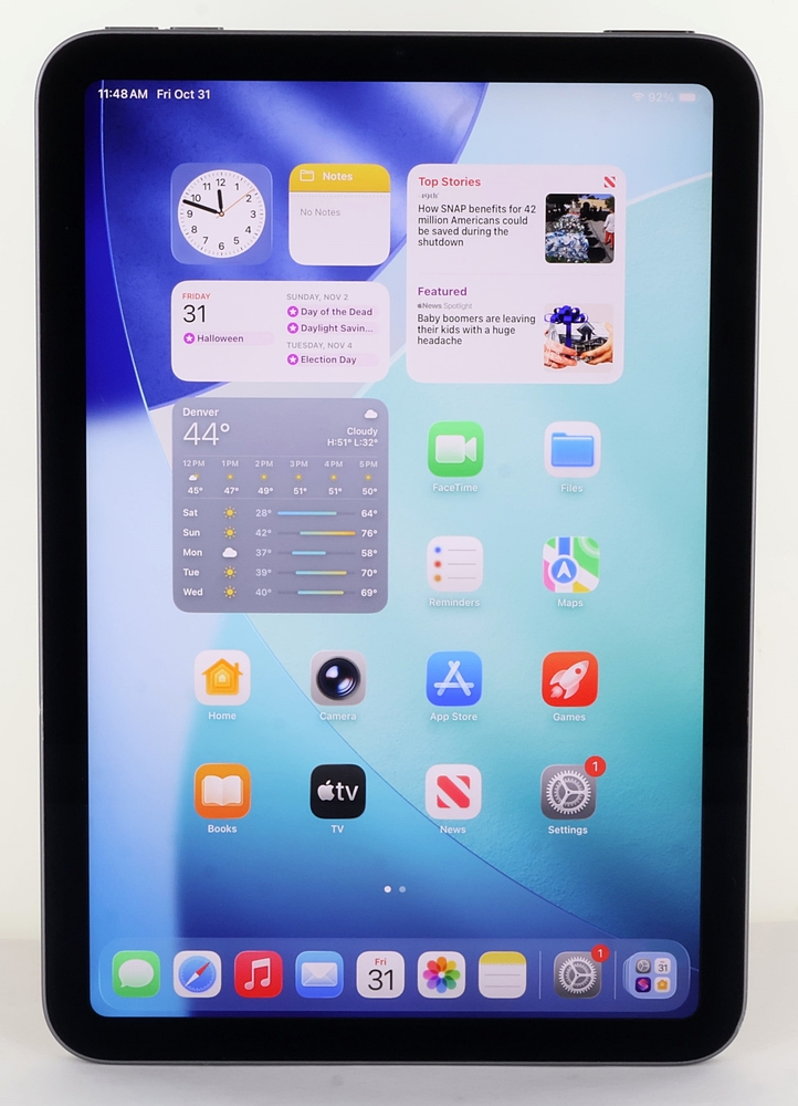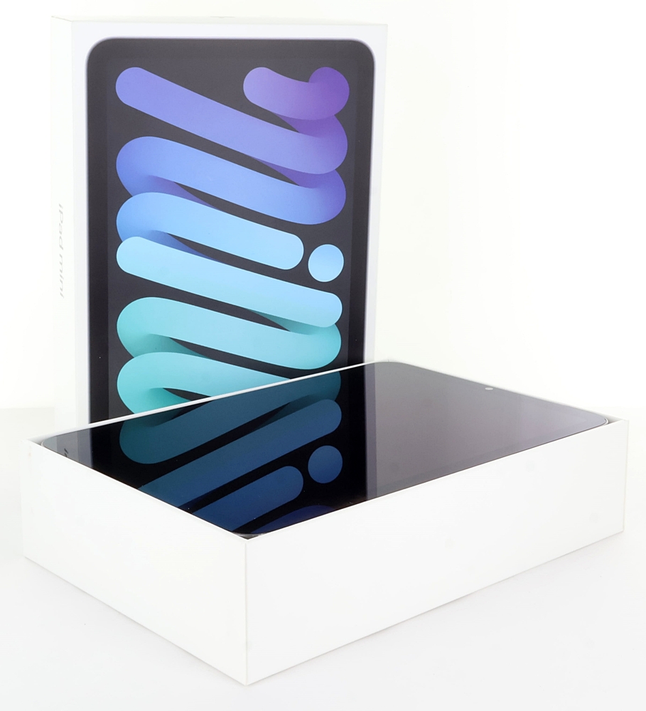 APPLE IPAD MINI, 6TH GEN, OS 26.0.1, 64GB, A15 BIONIC CHIP, WI-FI, SPACE GRAY (A2567, MK7M3LL/A) W/ FOLIO (PURPLE), ORIGINAL BOX