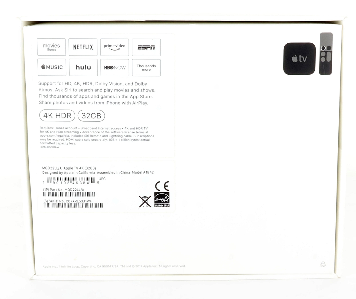 - Includes: Apple TV 4K Media Streamer, Remote, Power Cord, Manual, Original Box.